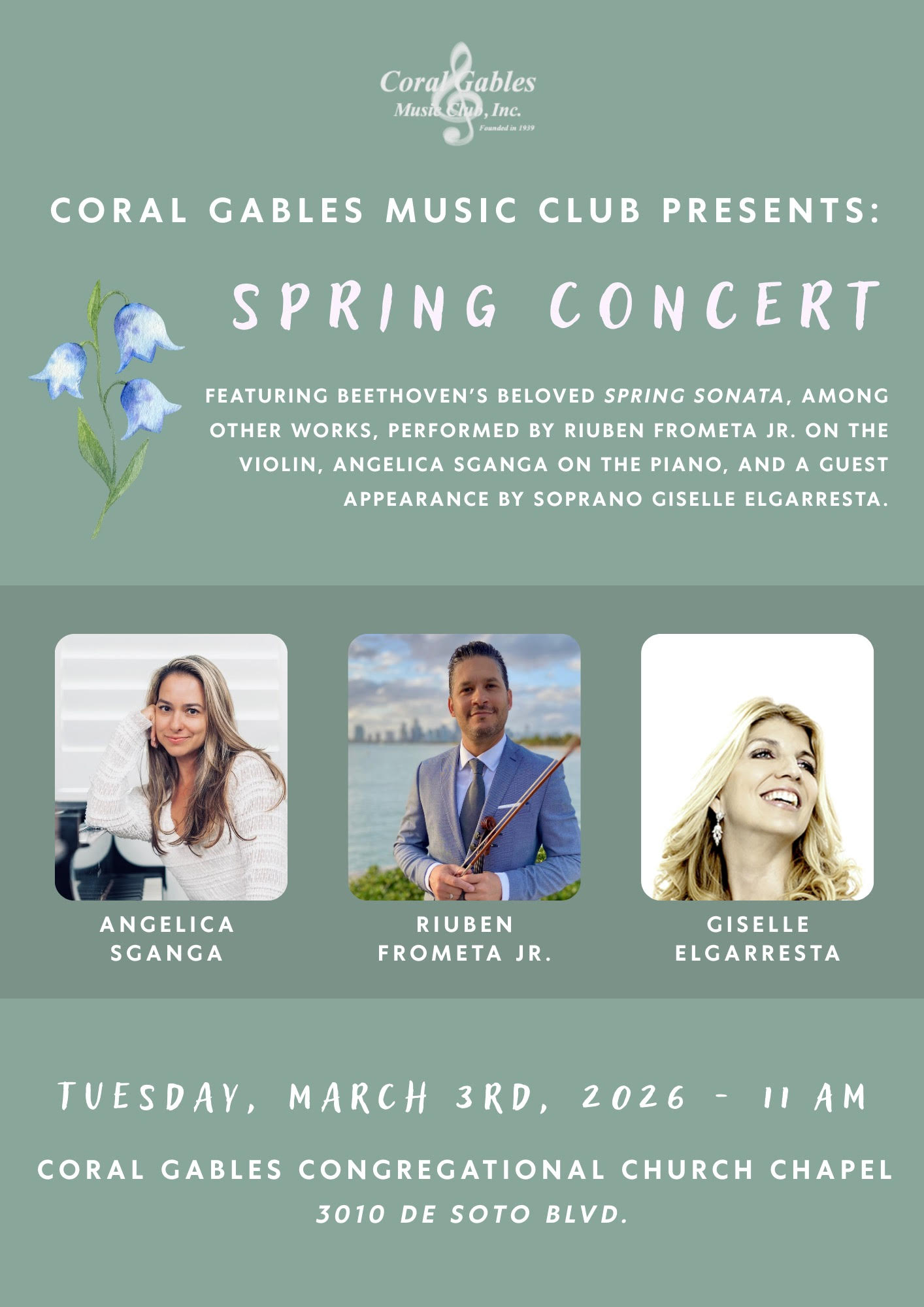 Our ‘Spring Concert’ will take place at the Coral Gables Congregational Church Chapel on March 3rd, 2026 at 11am featuring Beethoven’s beloved Spring Sonata, amongst many other works, performed by Riuben Frometa Jr. on the Violin, Angelica Sganga, piano and guest appearance by soprano Giselle Rios.